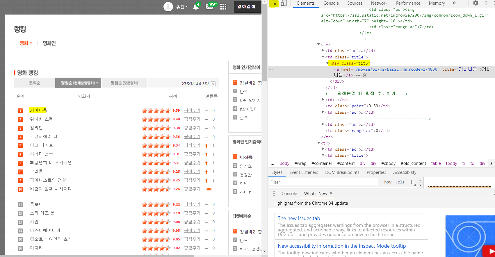 제가 가지고 와야 할 정보는 영화제목과 평점 입니다. f12번을 누르면 html 소스가 나타나는데, 영화검색 버튼 오른쪽에 노란색 하이라이트 친 부분을 클릭 후 '가버나움' 이라는 영화제목을 클릭하면 해당 소스가 어느부분인지 회색 블락으로 표시됩니다. 잘 살펴보면 div 태그에 class 이름은 tit5라고 지정되어있습니다. '위대한 쇼맨'을 클릭해도 div태그에 class 이름은 tit5입니다. 따라서 영화제목들은 <div class='tit5'> 로 가져올 수있습니다.