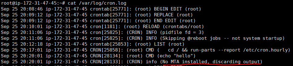(root) CMD (echo "hello")가 적혀있는 걸 보니 작동은 잘 된것같은데 밑의 이유('No MTA installed, discarding output')때문에 출력이 안되는 것 같았습니다. 구글링해보니 MTA가 리눅스의 메일서비스라고 하더라구요.
