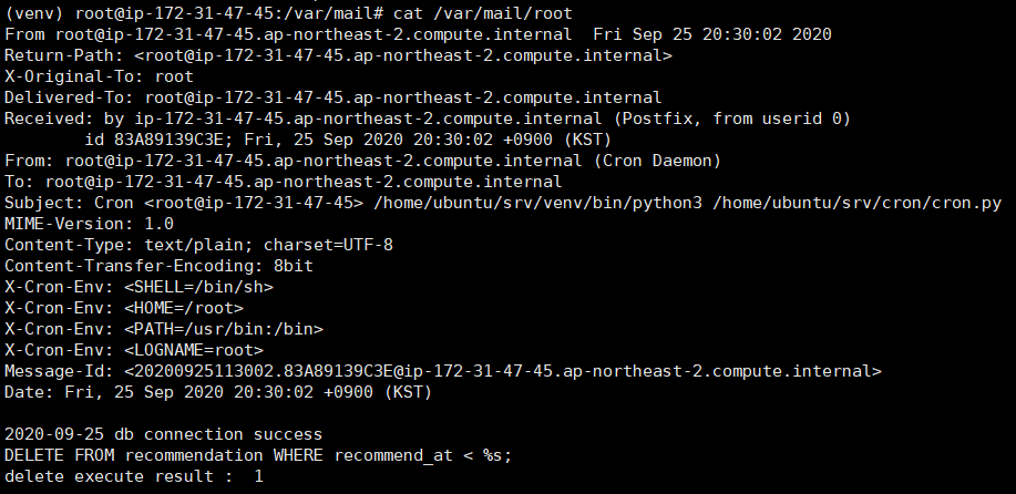 이후 원래 실행하려고 했던 파이썬 파일을 5분후에 돌리게 설정해두었더니 5분후 shell에 'You have mail in /var/mail/root ' 이 떠서 cat /var/mail/root 로 메일을 확인하니