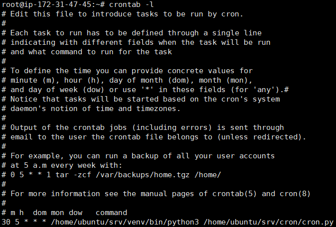30 5 * * * 는 매일 5시 30분에 실행하겠다는 뜻이고, python3 cron.py 를 실행하겠다는 의미입니다. 설정에 대한 것은 다른 블로그를 참고했습니다. 그리고 python파일을 실행시킬때 python or python3 의 절대경로와 실행시킬 파일의 절대경로를 적어주어야 합니다! python경로찾기는 which python3 명령어를 입력하면 됩니다. (참고블로그)