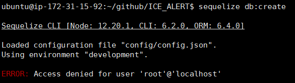 프로젝트 진행에 sequelize를 쓰기위해 db설정을 하는 도중 $ sequelize db:create 이 명령어에서 오류가 발생했다.