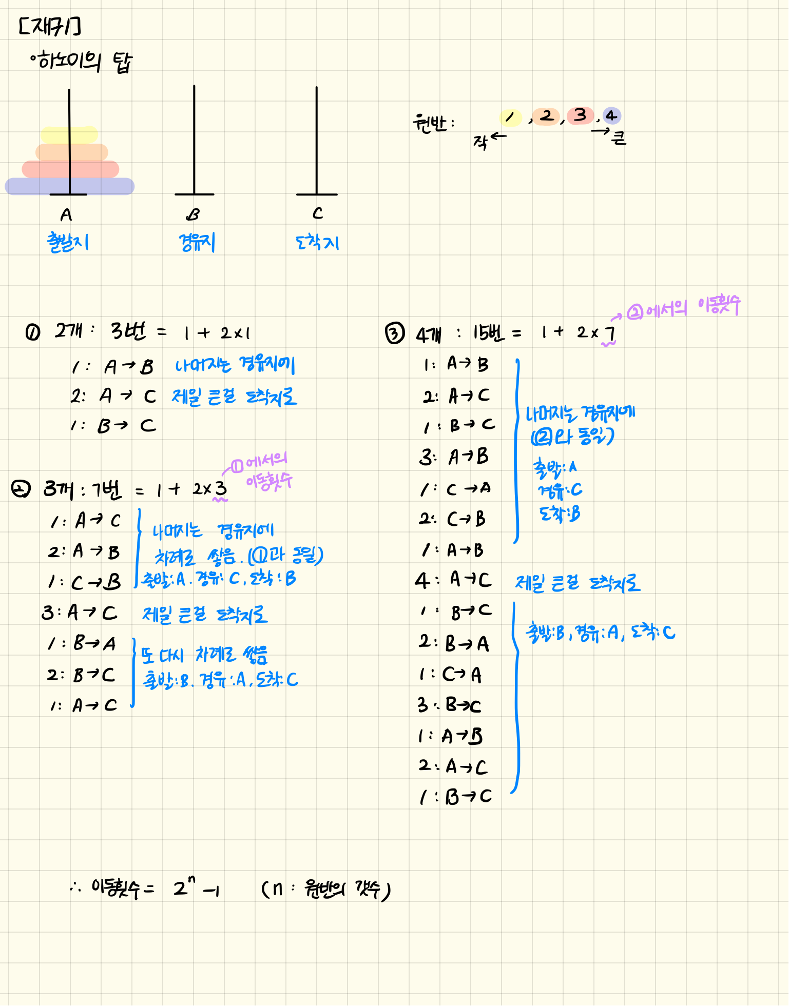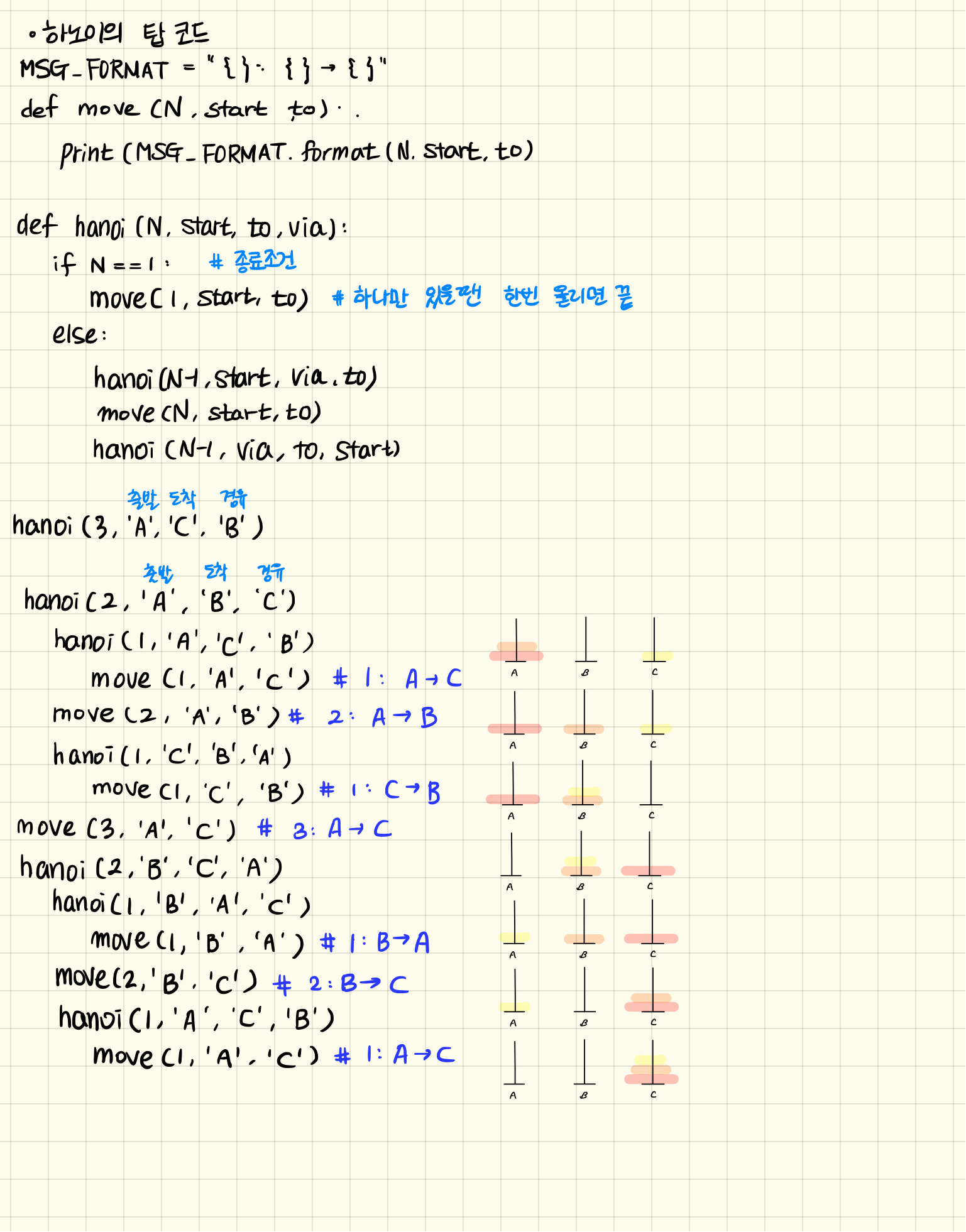 hanoi(N-1, via, to, start) # 경유지에 있던 모든 원반을 다시 도착지로 옮긴다