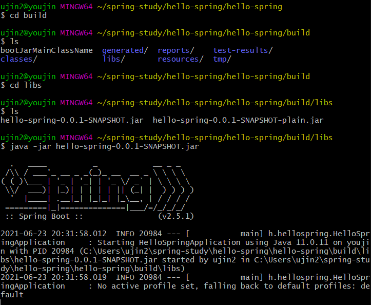 4. java -jar hello-spring-0.0.1-SNAPSHOT.jar 명령어 입력 => 프로젝트가 실행된다