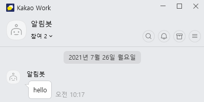 새로 생성된 알림봇과의 채팅방에 text hello로 톡이 온 것을 확인할 수 있다.