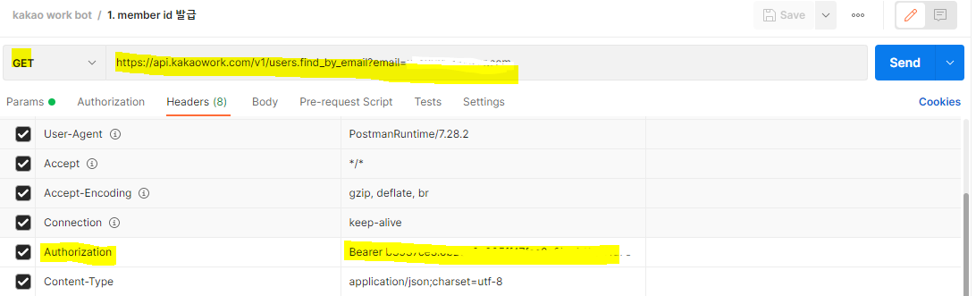 - 요청 url : https://api.kakaowork.com/v1/users.find_by_email?email={EMAIL}