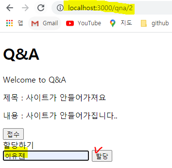 1. form에 처리할 직원의 이름을 넣고 할당 버튼을 누르면 req.body에서 name을 가져온다