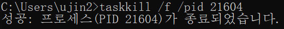 > taskkill /f /pid 21604 입력해서 프로세스를 종료시킨다.