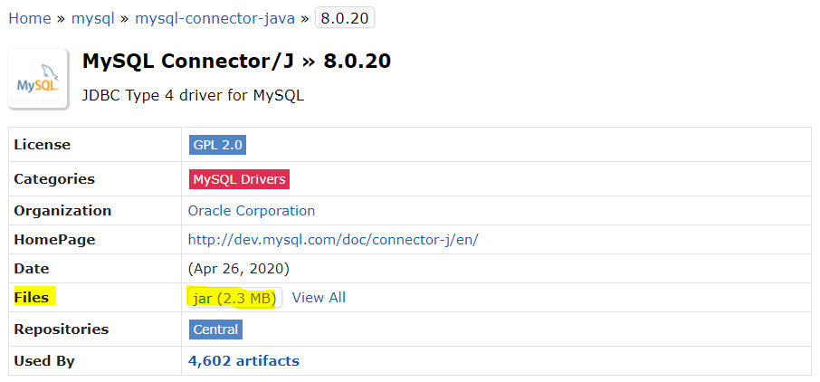 Files - jar을 클릭하면 jar파일이 다운받아진다.