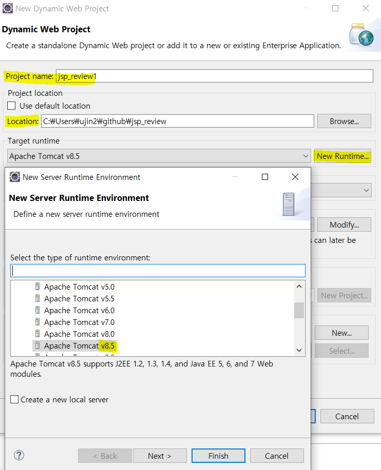 프로젝트 이름과 경로, Target runtime에서는 설치한 톰캣 버전을 선택하면 끝이다.
