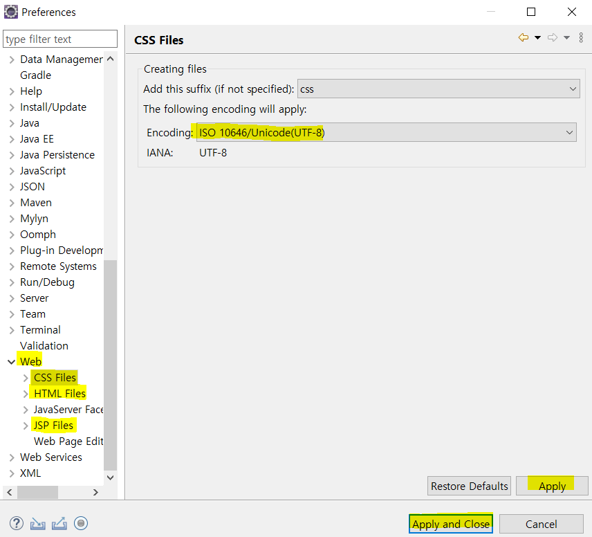 같은창에서 왼쪽에 스크롤을 내리면 WEB이 있는데 거기서 js, css, html, jsp 도 utf-8로 적용해준다.