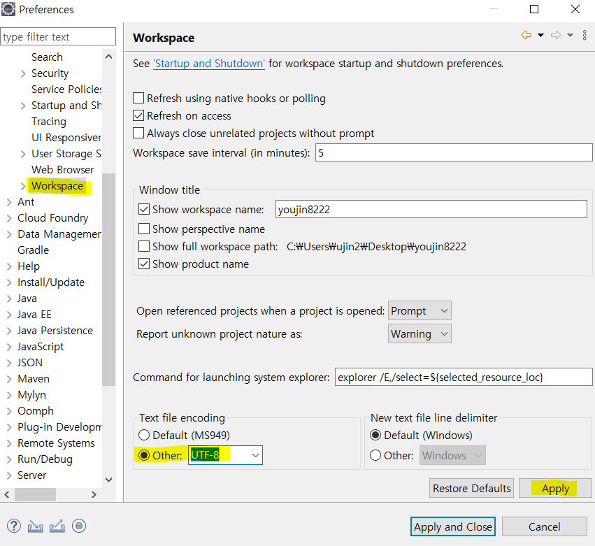 Worksapce, css, jsp, html 파일 인코딩을 utf-8로 통일해준다.