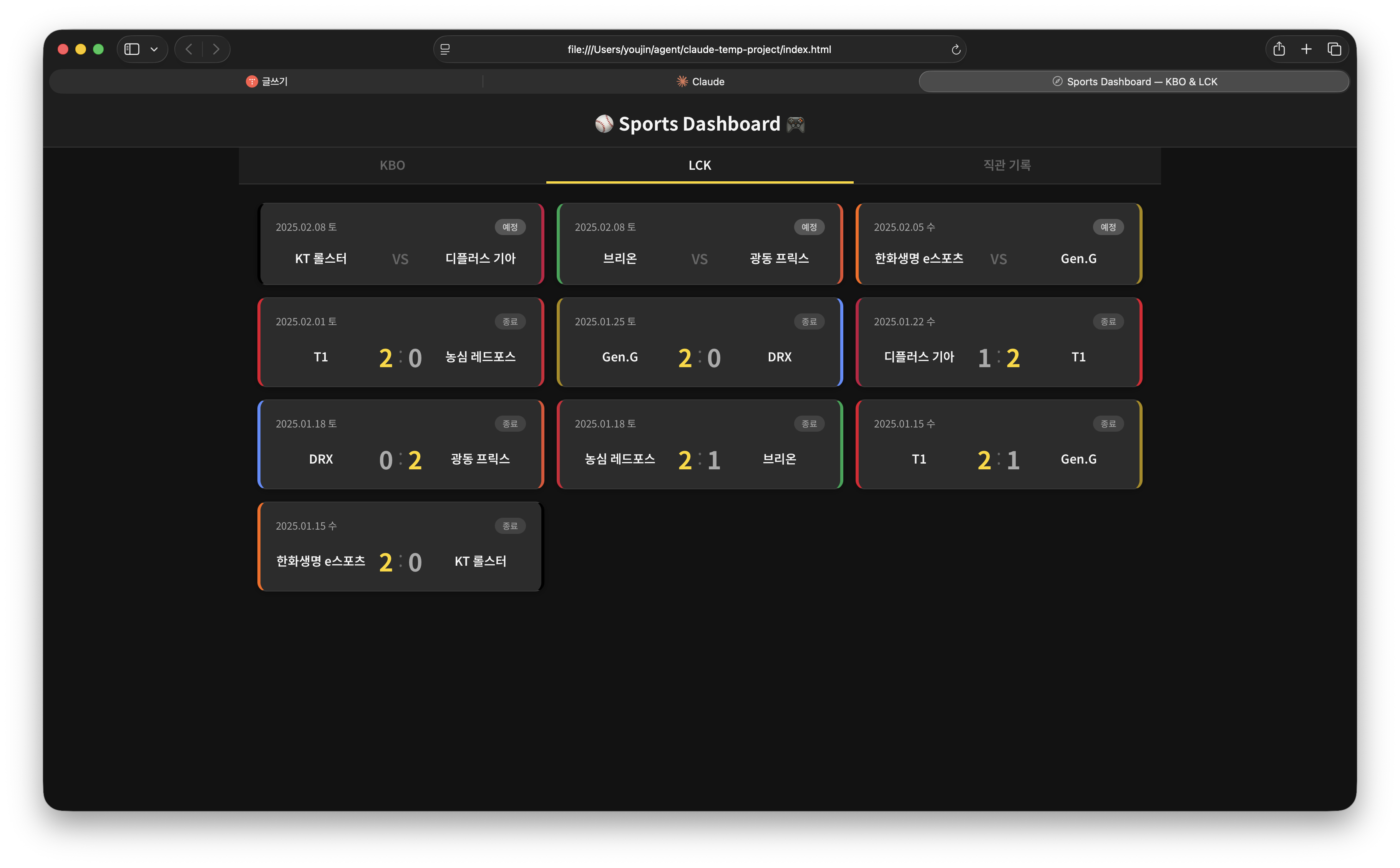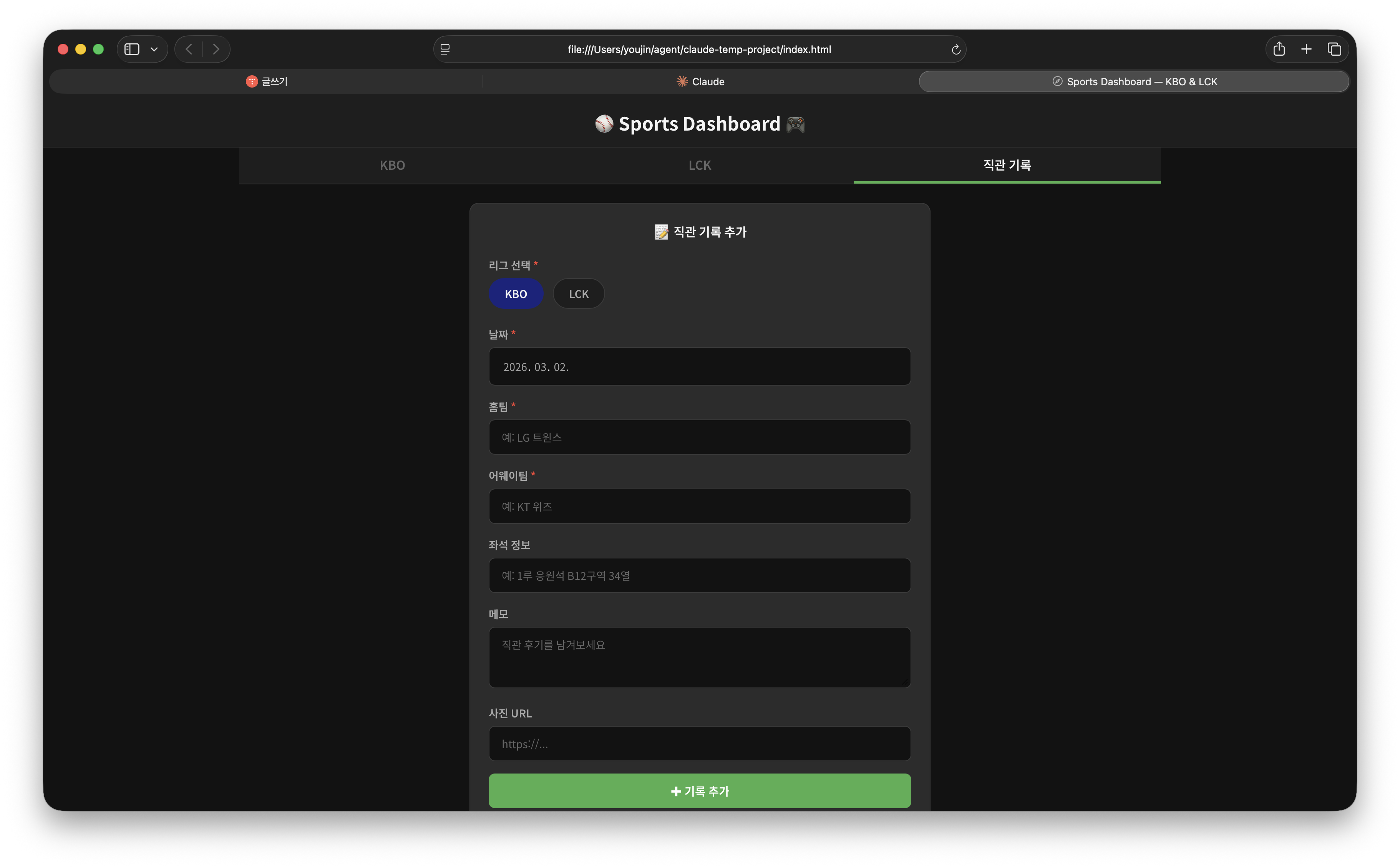 KBO와 LCK에 관심이 많은데 한군데서 해당 경기들 일정과 경기 결과를 볼 수 있었으면 좋겠어. 그리고 직관 간 기록을 남길 수 있는 기능도 있으면 좋겠어.